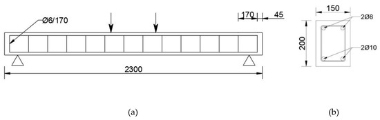 Geometry dimensions and rebar detailing of the selected simply supported beam are shown in Figure 2. In the chosen beam, the amount of the uniform corrosion on the tensile reinforcement was 14% steel cross-section reduction, and the uniaxial compressive strength of concrete is 34 MPa. In the present study, reduction of the mechanical properties of corroded reinforcement was considered using Equations (1)–(3).