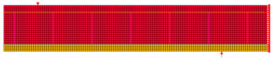 The two-dimensional (2D) NLFE analysis was performed in DIANA [56] by incorporating the material models. Only half of the beams were modeled to take advantage of the symmetry in geometry, supports, and loading conditions. It was assumed that the corrosion is uniformly distributed along the tensile reinforcements. A vertical stepwise incremental displacement was applied at the loading point in the model (see Figure 3). In addition, the nonlinear problems were solved using the modified Newton–Raphson approach.