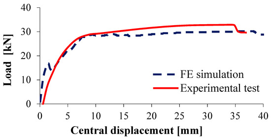 The obtained load–displacement curve at mid-span of corroded beam from nonlinear FE analysis (Figure 4) indicates good agreement with experimental observation at the ultimate limit state (ULS) and serviceability limit state (SLS). The results of FE simulation prove the accuracy and applicability of the proposed decay laws (Equations (1)–(4)) to modify the mechanical properties of corroded reinforcements.