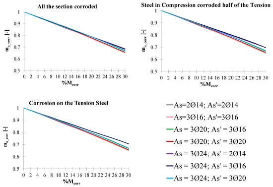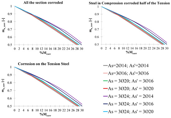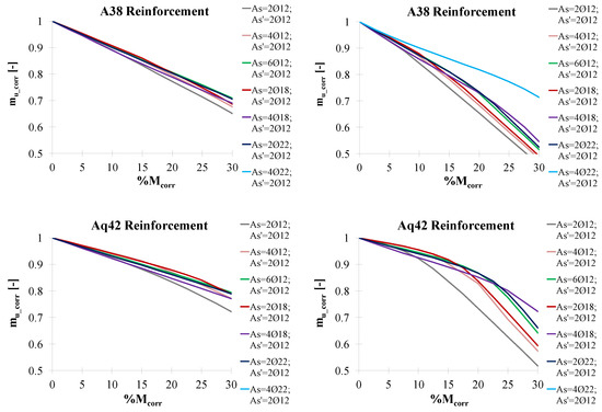 The abaci previously reported were defined considering beams whose dimensions and reinforcement comply with the principles of the current codes; the geometrical reinforcement percentage, in fact, is between 0.18% and 0.80% for the formed beams and between 1.75% and 2.35% for the flat beams. However, code limitations may not be satisfied by existing structures. For instance, in Italy, during the 1970s, the usual employed concrete had a mean (cubic) compressive strength of 20 MPa, while the reinforcements belonged to steels that were so-called A38 (σy = 380 MPa; σu = 460 MPa; εu = 14%) or AQ42 (σy = 230 MPa; σu = 420 MPa; εu = 20%). A (30 × 50) cm2 cross-section with a concrete cover of thickness equal to 2 cm typically characterized the formed beams. Moreover, the beams were designed to sustain only the gravitational loads and according to simplified formulations belonging to band criteria. Specifically, in compression, only two 12 mm diameter rebars were applied, with the mere function to support the stirrups, while in tension, from 2 to 6 bars with a diameter in the range from 12 mm to 22 mm were provided, depending on the effective load level. Some examples of abaci obtained for this typical condition are reported in Figure 11. The obtained results demonstrate once again the dangerousness of the pitting corrosion and the quasi-parabolic shape of the decay laws that are strictly related to the initial reinforcements mechanical properties.