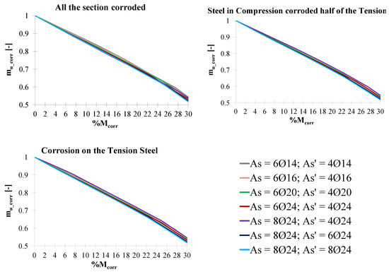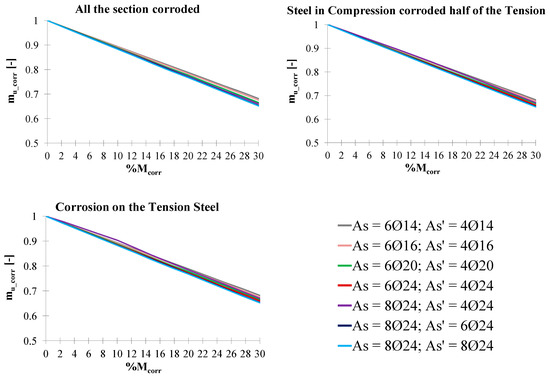 Parametric analyses have been performed considering three different corrosion scenarios: (i) a section corroded all around its perimeter; corrosion of steel in tension; the steel in compression corroded with half of the bars in tension in terms of mass loss. For each degradation condition, the pitting corrosion pattern was considered by applying the aforementioned decay laws and a classic uniaxial stress–plastic strain curve constitutive law to the reinforcements. According to EuroCode2 [62], the ultimate strength of steel is assumed equal to 540 MPa, while the characteristic strains are assumed equal to 0.655‰ for hardening initiation and equal to 10% for collapse. The concrete is conventionally modeled to the conventional relationship of Mander [63], assuming the presence of stirrups ϕ8/30 accounts for the confinement.