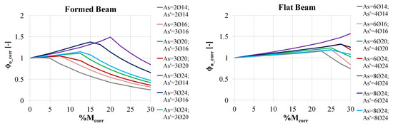 The analysis of the ultimate curvature of the two beam typologies appears very thought-provoking (Figure 10). In the case of the formed beams, both the corrosion level and the decay of the mechanical properties of reinforcements modify the collapse mode of the section. In cases of corrosion losses up to 5% in mass loss, the sectional collapse is governed by the reinforcement and not by the concrete anymore. Then, when the pitting corrosion damages the formed beam, the residual flexural strength of the elements strongly depends on the amount of longitudinal reinforcements. In a different way, in the case of the flat beam, corrosion modifies the collapse mode only for higher mass losses, and the dependence of the flexural decay law on the longitudinal reinforcements amount appears quite negligible.