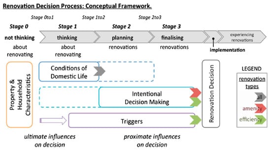 Wilson et al. [] developed a decision model depicting the decision-making process of each household towards renovations (Figure 1). In this model, the stages of the renovation decision process are “thinking about” (Stage 1), “planning” (Stage 2), and “finalizing” renovations (Stage 3). A final “experiencing” stage describes how households experience and adapt domestic life to the structural changes made to their home. The transition from each stage to the other is affected by factors which are described in the following subsections.
