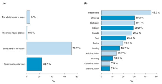 Most house owners have planned to renew at least some parts of the house while only a small minority (about 5.5% of the respondents) declare that they will renew the whole house, in most cases step by step (Figure 2a). Most items to be renewed are related to the aesthetic aspects of the house—such as the kitchen, bathroom or indoor walls—while the windows are the most common item in this list having a significant impact on the building energy consumption (Figure 2b).