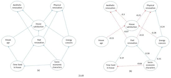 PLSPM analysis of physical and aesthetic renovation plans: (a) the model structure; and (b) the path coefficient estimates (paths with negative coefficients are dashed, and non-significant paths are omitted).