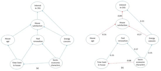 To understand better the factors affecting the interest for comprehensive energy renovation, we estimated a PLSPM model similar to the one above, although with just one terminal node reflecting the question about the respondents’ interests in the one-stop-shop concept (Figure 3a).