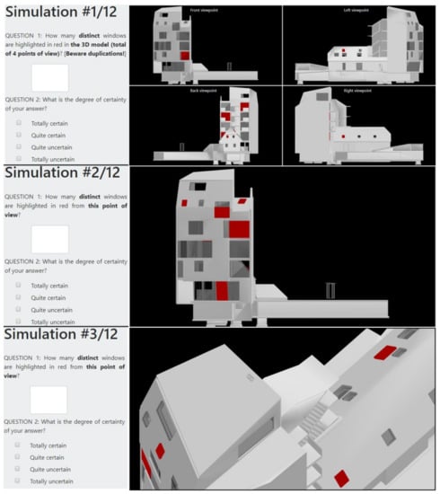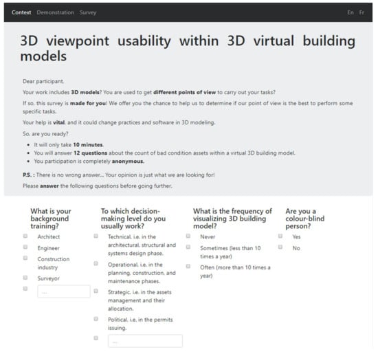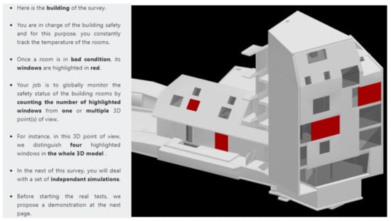 - The second section presents the 3D building model of the survey, sets the context of the case study, and proposes a demonstration test from which the participant gets acquainted with the questions and the procedure for answering.