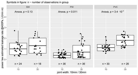 Figure 7 shows that in the case of planed timber, the airtightness did not fail. In the case of the PVC surface, the proportion of failed test specimens was 16% and 28%, respectively, for 10 mm and 30 mm joint widths. Joints with a sawed wooden surface performed significantly worse, with a failure rate of 33% and 50% for 10 mm and 30 mm joint widths, respectively.