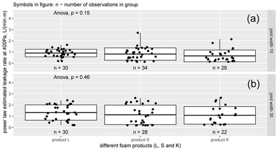 Different foam products were compared in this study, and although our detailed analysis within subgroups of different lath surfaces and joint widths indicated some differences between specific foam products in some cases, statistically significant differences were not found. It has to be noted that top-of-the-line high-quality polyurethane foams from each producer applied by skilled workers in a laboratory setup were measured in this study. The skill level of the workers and real-life application conditions can significantly influence the performance of different foams and cause higher air leakages compared to those measured in the laboratory, although this has to be further studied.