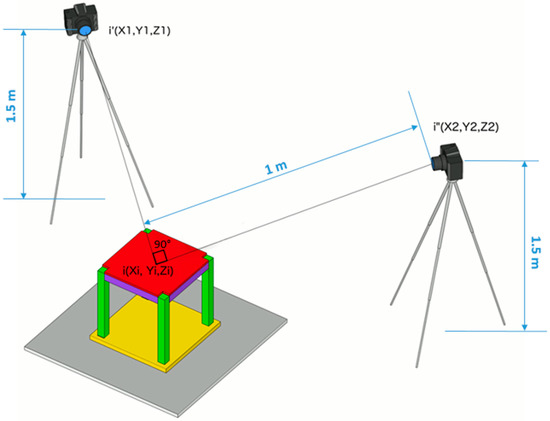 Figure 1 shows the location of the cameras relative to the test model fixed on the shake table. Points i´ and i″ represent the projections of an arbitrary point on the test model on each camera charge coupled device (CCD). Coordinates of each point projected on the CCD are calculated by knowing the lens and camera specifications, such as focal length and CCD size and resolution [25].