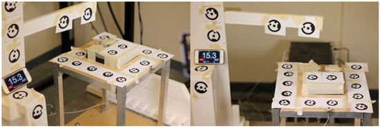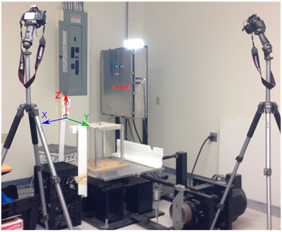 The coordinate of each point in a single image is based on the known focal length of the camera, which is the distance between the lens and the imaging sensors [26]. The focal point is where light rays intersect in the camera. The coordinate of objects in two overlapping images taken by two cameras can be computed based on the known coordinate of their focal points. These coordinate calculations should be corrected based on the radial and decentering lens distortions, which are calculated during camera calibration when actual distances of objects in the image are known [27]. The shake table used in this study is a single degree of freedom aluminum table with dimensions of 76.2 × 76.2 cm. Its operating frequencies range from 1 Hz to 100 Hz. The maximum nominal payload of the table is 113.4 kg. The peak displacement and acceleration are ±7.62 cm, and 1.5 g, respectively.
