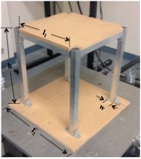 A simple and light temporary 3D aluminum frame is built to determine the required size of the final test model and the desired locations of targets. After a few preliminary tests and adjustments, a 3D one-story frame, with the dimensions shown in Figure 4 and Table 1 is built. Beams and columns are made of aluminum box sections while the roof and base are made of plywood with a thickness of 13 mm. Beam to column and column to base connections are made of aluminum angles, bolts, and nuts. A mass of 8 kg is fixed on the roof diaphragm to increase the mass of the frame and the dynamic displacements. Coded targets to be traced by PMM are fixed on the roof and base of the structure. Additionally, two single access accelerometers with a logging time step of 0.00125 sec are installed along the Y access of the coordinates (defined at Figure 2) on the roof and the surface of shake table.