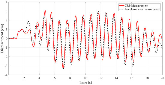 Comparison of CRP results and accelerometer’s measurement at top of the one-story structure due to the 1 Hz sinusoidal displacement with an amplitude of 2 cm at the base.