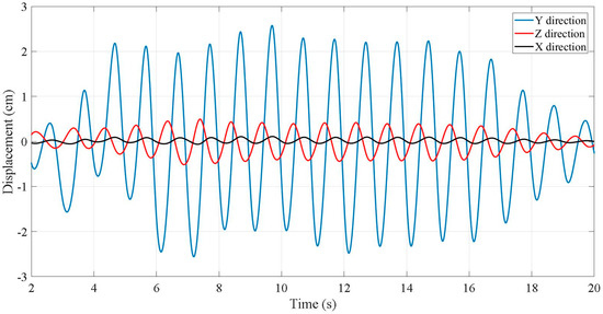 It is important to notice that the test model is a 3D model and can move along different directions. The accelerometers measured the acceleration only along one direction, more accelerometers would be needed to measure the acceleration in the other two directions. However, CRP measured the displacements along three independent directions at once, which is one of the advantages of CRP over the traditional measurements of displacements using accelerometers. Figure 7 shows the displacements of the test model’s roof in all three directions: vertical (Z), perpendicular to the load in a horizontal plane (X), and in along the loading direction (Y).