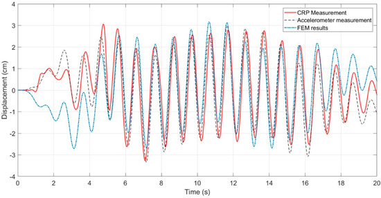 Figure 8 shows the displacements obtained by CRP, accelerometers, and the FEM model. The results show the location error after compensating for 0.32 degrees of lead never exceeded 0.5 cm; though at the beginning and end of the displacement-time history the FEM results differed from the actual measurements, due to ragged increase in the frequency of shake table in a short time. As the structure is modeled with measured stiffness of connections in the direction of the applied dynamic load, the FEM model is not considering the displacement in other directions perpendicular to the dimension of the applied load.