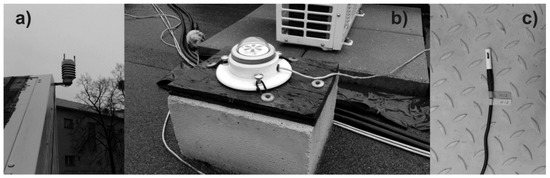 Figure 1. Measuring equipment, instruments for measuring environmental values: (a) weather station; (b) pyranometer; and (c) temperature sensor and relative humidity of the air [28,29].
