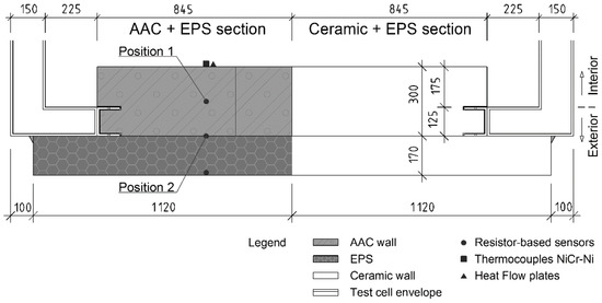 Figure 2. Configuration of the wall of the test cell and the position of the measuring sensors. Section view of the AAC section [28,29].
