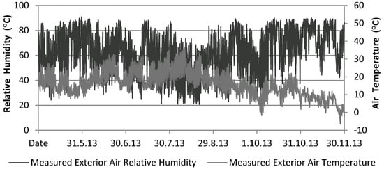 Figure 3. The measured outdoor air temperature in (°C) and the relative humidity of the air (%) for the locality of Košice. Displaying the selected period from May 2013 to December 2013 [28,29].