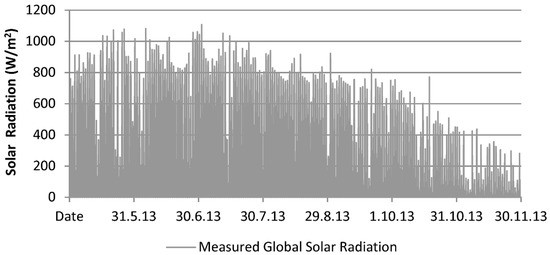 Figure 4. Global Solar Radiation (W/m2). Measured data for the locality of Košice. Displaying the selected period from May 2013 to December 2013 [28,29].