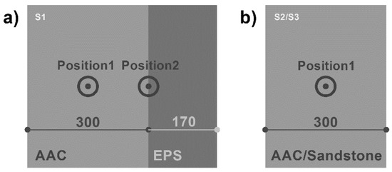 Figure 5. Sample structures, according to Table 2 (inside left). (a) An external test cell wall; and (b) simple AAC and sandstone walls. The placement position for the plotted data are: the calculated temperatures in Figure 8 and Figure 10 in specimen S2/S3, in Figure 12 and Figure 13 in S1 and the measured temperatures in Figure 15, Figure 16 and Figure 17 in specimen S1.
