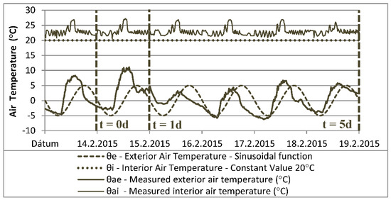 The exterior and interior temperature in the period from 15 to 20 February, 2015 are selected (in fact, from 14 February, 2015, for the purpose of the preliminary calculation). In Figure 6, the temperatures obtained from the weather data packet are selected and plotted. Simple sinusoidal functions for external and constant internal air temperatures used in simulation of sample walls are also plotted. In Figure 7, measured temperature values of the interior and exterior surfaces are plotted. These are used as the boundary conditions for validation with a full-scale experiment (Chapter 3.2).