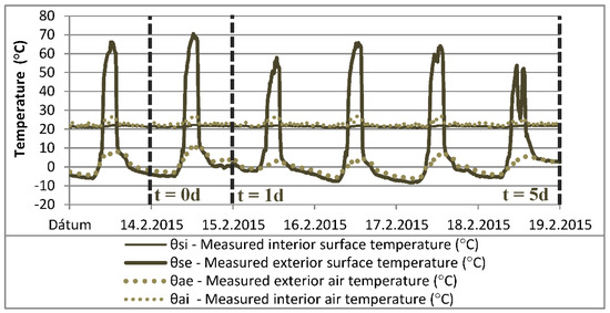 Figure 7. The measured temperature values of the interior and exterior surfaces for the analyzed interval (14 February 2015 to 19 February 2015).