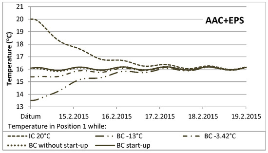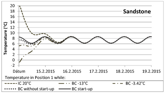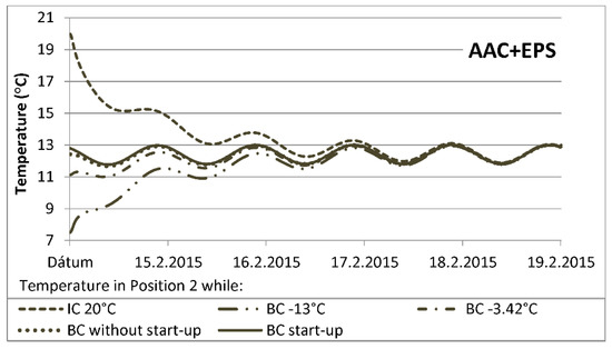 The graphs of the temperature course ( Figure 8, Figure 10, Figure 12 and Figure 13) indicate that considering IC as the constant for the whole profile of the structure (IC 20 °C), or considering the calculated stationary profile using the standard outdoor temperature (exterior boundary conditions, BC −3.42 °C and BC −13 °C), causes uncertainty. During the simulation, the temperatures were gradually approaching the course calculated from the actual boundary conditions, with or without start-up pre-calculation (Chapter 3.2, fourth and fifth cases). In Chapter 3.2, in the validation of the numerical model of the measured data, we have considered only these initial conditions (fourth and fifth cases).