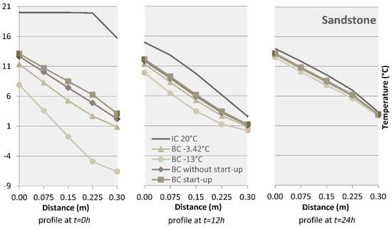 Figure 9. Temperature profile across the simple sandstone test wall at time t = 0 h, t = 12 h and t = 24 h for five cases under the initial condition. Abbreviations IC and BC refers to Section 2.4.