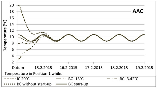 The temperature buffering time over the structure is extended when the thermal transmittance is decreased (application of external thermal insulation composite system, ETICS). When AAC with ETICS is used, temperature buffering takes five days or more (Figure 12 and Figure 13). If the temperature course analysis in the structures has short time intervals, the correct initial condition is highly recommended and relevant.