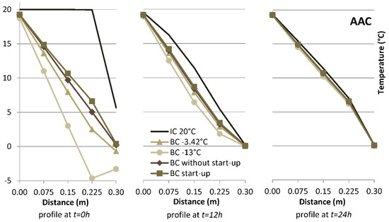 Figure 11. Temperature profile across the simple AAC test wall at time t = 0 h, t = 12 h and t = 24 h for five cases under the initial condition. Abbreviations IC and BC refers to Section 2.4.