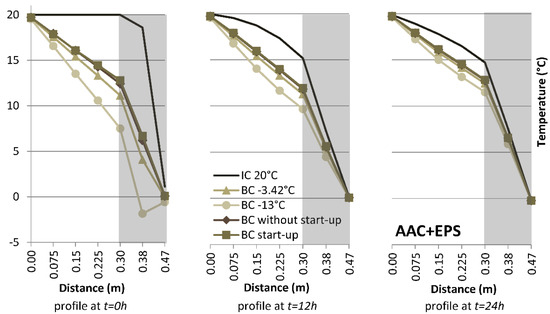 • In the first case: in time t = 0, the constant temperature value 20 °C is set across the wall profile (denoted as IC 20 °C in Figure 8, Figure 9, Figure 10, Figure 11, Figure 12, Figure 13, Figure 14, Figure 15, Figure 16 and Figure 17).