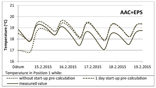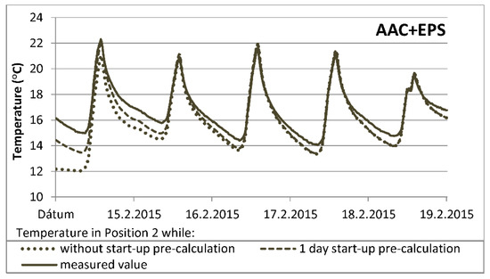 Courses of temperature at selected points of the insulated envelope—as shown in schemes (Figure 5)—are compared in Figure 15 and Figure 16. The temperature is calculated using start-up pre-calculation and then again without it, and the results are compared with the measured values. Temperature-data—calculated over one day of start-up pre-calculation—are a better match with the measured values within five days after the beginning of the evaluation process. At the beginning of the simulation, the difference between the measured and calculated temperatures for position 1 is only 0.2 K, and for position 2, the difference is 1.9 K. However, without start-up pre-calculation, the differences come to 1.9 K for position 1 and a much larger difference of 4.0 K for position 2. The average difference between the measured and calculated temperatures during the first 24 h of simulation without start-up pre-calculation is 0.9 K for position 1. For position 2, the difference is 2.2 K. Using start-up pre-calculation, the temperature differences are 0.1 K for position 1 and 1.0 K for position 2. Deviation between the measured and simulated temperature courses, especially in position 2, decreases during simulation. The average difference during a simulation interval, from day 2 to day 5, in measured and calculated temperatures without start-up pre-calculation for position 1 is 0.6 K, and for position 2, the difference is 0.5 K. Using start-up pre-calculation, it is 0.7 K for position 1 and to 0.3 K for position 2. This action on the course of the temperature (profile) across the envelope (Figure 17) is obvious; the calculated values are satisfactory due to the very accurate and exact application of start-up pre-calculation. The temperature equilibrium is observed after around five days of simulation. The influence of the IC consideration on the next results is negligible.