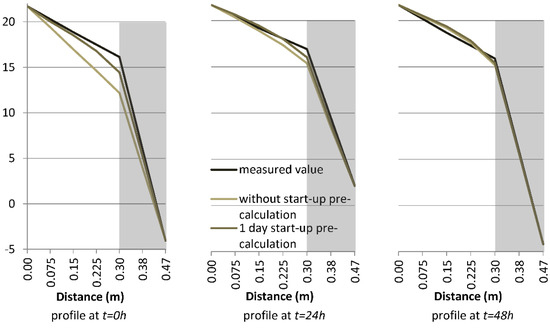 Figure 17. Temperature profile across the outdoor test cell wall S1 at t = 0 h, t = 24 h and t = 48—with and without pre-calculation considerations.
