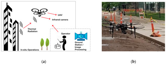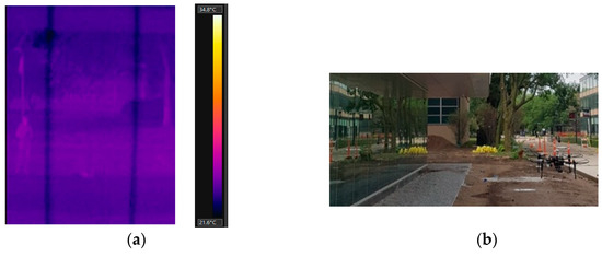 Figure 6. Collecting noncontact temperature from the building envelope using UAV. (a) Frame of thermal image; and (b) data collection using UAV.