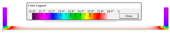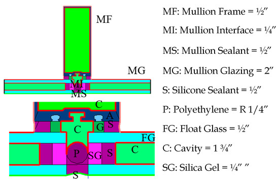 To build and analyze the heat-transfer model, a computer simulation application (THERM) modeled the two-dimensional heat-transfer effects in windows. The application used two-dimensional conduction heat-transfer analysis, enabling the evaluation of the product’s energy efficiency and local temperature patterns. Inputs included the manufacturer’s specifications for glazed system products, which were provided by the representative of the owner, the boundary conditions of indoor and outdoor geometries, and the temperature and relative humidity. Outputs included the minimum and maximum temperatures and U-factors. An example of the materials for the heat-transfer model is shown in Figure 3. To frame the simulation on the desired components of curtain wall systems, a limited area of the glazed-framed façade was analyzed (the glazed window section). Given the symmetry of the frame, segments with an equivalent distance between mullions were studied with the intention of covering a broader area for thermal analysis. The segments were located on areas with reduced environmental disturbance conditions or on areas away from locations where the position or geometry of the frame led to the prevalence of high-temperature effects. For the exterior surface, for example, the origin was the interface, and the endpoint was the midpoint of the crystal, between mullions. Temperature and relative humidity for indoor and outdoor surfaces were 27.2 °C and 65% and 26.0 °C and 72%, respectively. Wind conditions were calm (<1 m/s). These parameters were included as boundary conditions in the model. They were simultaneously collected for consistency when the IR experiments using the UAV were carried out.