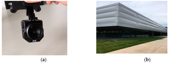 Figure 5. Instruments used for emissivity data collection and building façade project. (a) IR sensor: Flir Vue Pro-R 640 9 mm camera; and (b) façade for experimentation.