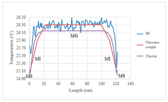 Figure 7. Comparison of thermocouple, IR and THERM software temperature distributions.