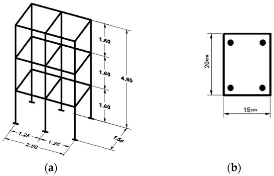 The prototype is a 1:2 scaled three-storey building, as can be seen in Figure 1, aimed at reproducing the typical RC masonry buildings of Turkey. The construction stage analysis was constructed by adding one storey to the structure at each stage. In the third storey, for the whole building, the brick walls were built, and at the last stage, all exterior walls were coated by the cement plaster. All stages were done on one completed model. The typical storey framing consists of reinforced concrete slabs, and sections of 150 × 200 mm for columns and beams, which are shown in Figure 2b, with constant size at all storeys. The thickness of the brick walls and the cement plaster are 190 mm and 20 mm, respectively. The main construction stages of the buildings can be classified into three stages: Bare frame, brick-walled and coated brick with dimensions of 2.5 m length, 1.5 m width and 4.8 m height. Other dimensions and section properties of the RC building elements are given in Table 1.