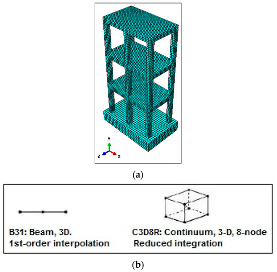 (a) FE model of building. (b) Solid finite element model Shows the element adopted by ABAQUS.