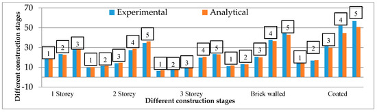 Secondly, the static analyses are conducted under the RC building’s self-weight and live loads. A live load of 3.5 kN/m2 is taken into consideration in the analysis as suggested for the design of masonry structure in Turkish load standard TS498 [34]. The displacement and principal stress of the building model varied depending on various construction stages. For a comparison between these values, Table 6 presents the ultimate displacement and principal stress of each construction stage below.