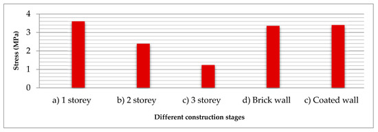 The maximum value obtained from the coated brick model is 3.41 MPa, a slight difference compared with that recorded from the uncoated brick case, determined as 3.36 MPa, which is shown in the Figure 6. Even if the stresses that occurred on coated brick walled model are slightly high, it is much less than the crushing limit of the masonry. The values of the average maximum principal stress for masonry units (10 MPa) and minimum principal stress (1 MPa) are reported by Ural and Dogangün [35].