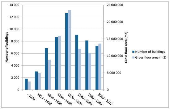 At the end of 2012, 44% of all dwellings in Finland were in blocks of flats []. In Figure 2, the Finnish multi-family apartment building stock at the end of 2012 is shown, divided based on the construction year []. In total, there are almost 58 000 apartment buildings in Finland with a total gross floor area of about 92.5 million m2. The majority of these buildings were built in the 1960s, 1970s and 1980s. In 2012, the average floor area of a dwelling in a block of flats was 56.5 m2 [].