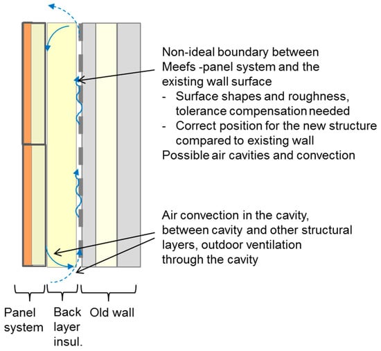 If there is any air flow between this cavity and the outdoor air, this air flow causes heat losses that may considerably reduce the effectiveness of the additional thermal insulation. Figure 5 presents the critical contact conditions and possible convection routes in the structure renovated with the Meefs panel system.