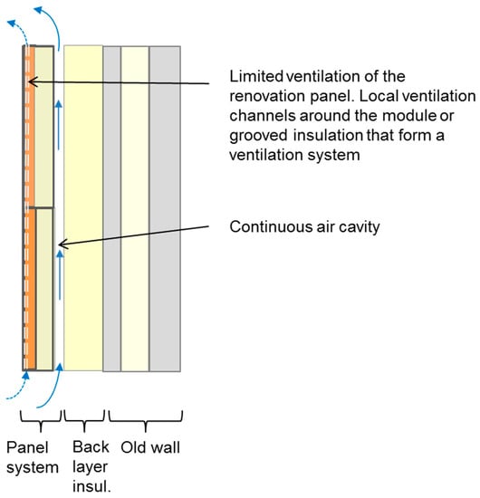 - The drying of initially wet wall structures through the renovated system was possible only when the ventilation air flow rate was high enough (50 air changes in a 10 mm continuous one floor high air cavity) and the ventilation took place between the new insulated module and the back layer insulation. In this case, the effectiveness of the thermal insulation on the exterior side of the ventilation cavity will be reduced severely.