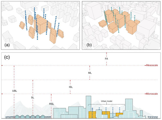 3D visualization of generated urban models in this study: (a) low-density urban model (LD), (b) high-density urban model (HD), (c) schematic section of the generated urban models: RSL: roughness sublayer; SL: surface layer; UBL: urban boundary layer; ISL: inertial sublayer, ML: mixed layer; FA: free atmosphere.