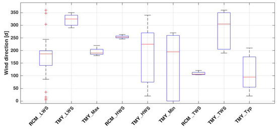These weather datasets were used as inputs for boundary conditions in the CFD simulations in each hour. In a parallel process, the same period with a similar approach and method were extracted out of TMY weather files with EPW format for EnergyPlus [52] to evaluate the accuracy of the widely available weather files for energy simulation. Thus, three 24-h continuous data in the same dates were generated out of the TMY files for Stockholm. For example, in low wind conditions, the weather data of 4 October were extracted. The weather data in these three days in the RCM and TMY files are notably different. In other words, typical and extreme low and high wind conditions in the TMY file occur on different days. Thus, to examine the accuracy of the TMY file in predicting typical and extreme conditions, the same logic used to generate RCM files was adopted to extract three other weather files based on absolute typical and extreme low and high wind conditions out of TMY files. These three 24-h continuous data based on the TMY file for typical wind speed or ‘TMY-Typ’ (14 September), the highest wind speed or ‘TMY-Max’ (13 January), and the lowest wind speed or ‘TMY-Min’ (17 November) were generated. In total, six 24-h continuous weather data out of TMY files as well as three weather datasets from synthesized datasets as mesoscale data were generated. Figure 2 shows the boxplot of wind direction frequency in the generated RCM and TMY weather data. The typical and extreme low and high weather data out of RCM data were used as inputs for simulating microclimate conditions by means of CFD calculation, which resulted in three microclimate datasets (Section 3.1). Table 1 shows the details of each generated weather data in this study.