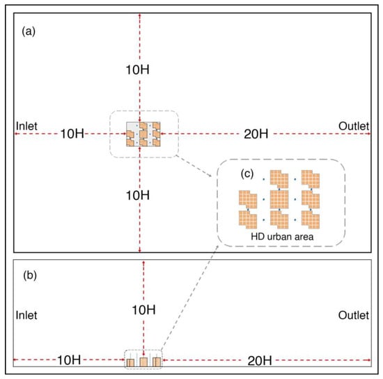 Computational domain defined for the computational fluid dynamics (CFD) simulations. (a) plan view of computational domain; (b) section view of computational domain; (c) HD urban area.