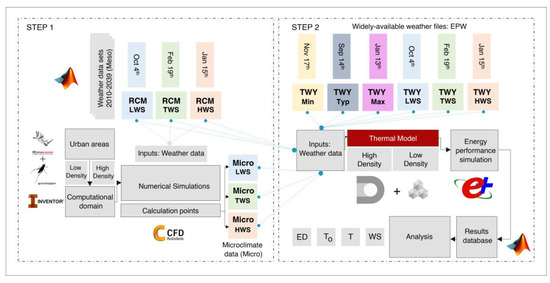 It is crucial to develop a method that considers microclimate data in both typical and extreme conditions in regular EPS studies as it affects several engineering applications in buildings. In this regard, there have been some attempts to develop a multiscale method that takes into account microscale data by comparing the results of high-resolution metrological mesoscale models (such as Weather Research and Forecasting (WRF) model [17] and remote sensing methods [18]) at the near-surface ground level [19,20]. These models [21] have usually focused on non-urban areas or have not focused on evaluating the energy performance of urban areas, and consequently, they cannot be directly applied in the current commercial BES tools. A comprehensive review on the main approaches for modeling and simulating urban areas and microclimate conditions can be found in [22]. There are several challenges in modeling and simulating urban microclimate conditions, even though it is commonly accepted that urban morphology has a major impact on microclimate conditions [23]. To overcome the limitations and complexities of modeling urban microclimates, experimental methods (for models with low temporal and spatial resolutions) [24], mathematical/analytical methods [25], numerical methods [26] or a combination of these methods [27] have usually been adopted in the current literature. Numerical methods, due to their flexibility and accuracy in predicting local-scale phenomena in urban areas, have been widely used to study microclimate conditions and urban wind comfort [28]. Several research works have adopted numerical methods to study microclimate conditions by means of computational fluid dynamics (CFD) with detailed approaches (for small-scale cases or a limited number of iterations) [29] or with more simplified approaches (for larger urban areas and a higher number of iterations) [30]. It is commonly accepted that the urban geometry or form can change microclimate conditions [31]. Thus, most studies have used generic configurations [32] or real-site cases [33] as urban areas, and some have adopted a combination of these models [34]. The main factors in the urban microclimate that have been investigated include air temperature [35], surface temperature [36], solar radiation [37], wind flow variations [38], and air humidity [39]. Many works have studied the UHI effect on the energy performance of buildings [40,41] and its impacts on higher cooling demand in cold regions and lower heating demand in hot–arid regions [42,43] in urban areas.