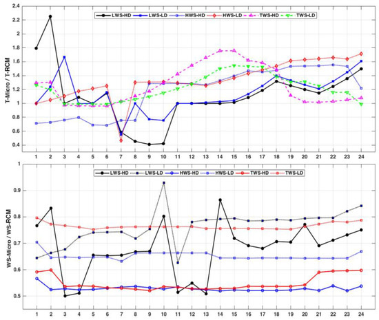 Normalized hourly air temperature (T) and wind speed (WS) at microscale as a function of mesoscale data (as inputs for CFD simulations). Typical wind speed (TWS): 19 February; lowest wind speed (LWS): 4 October; and highest wind speed (HWS): 15 January. HD: High density; LD: Low density.