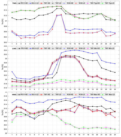 The outside differences between adopting Micro data for running EPS compared to RCM or TMY data induced higher heat transfer rates and, consequently, a higher indoor temperature. Figure 8 shows the hourly of the central buildings (average of all thermal zones) in LD and HD areas. The results of the were notably affected by the defined temperature set points of the Heating, Ventilation, and Air Conditioning (HVAC) system in the building (Section 3.3). In TWS, average adopting Micro data is over 1% and 3% higher than the results with RCM data in LD and HD areas, respectively. However, considering Micro data, the average is about 4% and 1% lower than the regular TMY file. The results showed over 7% lower considering Micro data compared to the typical conditions of TMY data (TMY-Typ) in both areas. In response to higher in LWS conditions, the average is slightly higher (about 1%) adopting Micro data compared to the RCM and TMY data. The difference between Micro and TMY-Min data is a little bit higher, equivalent to 4%. A similar trend can be observed in the HWS conditions, where the average is about 2% higher considering Micro data compared to the Meso, TMY, and TMY-Max. A slightly difference in results causes notable variations in calculating indoor thermal comfort and the total energy demand of the buildings. By considering extreme microclimate conditions in the simulation, average in all cases are higher compared to other regular weather datasets. Moreover, in response to higher outside air temperature and in most hours of the day, the average in LD areas with similar conditions is higher than in HD areas.